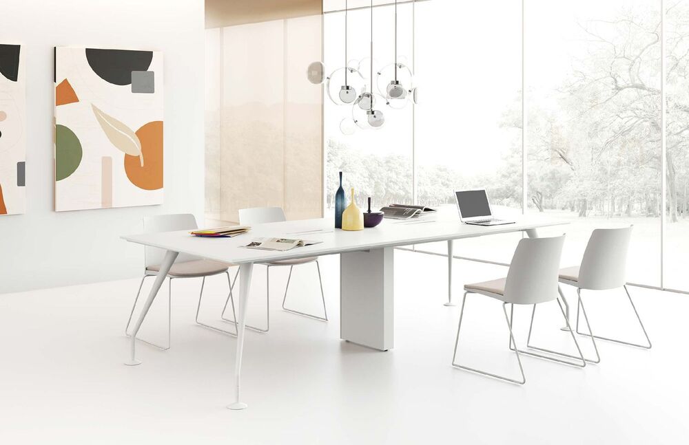 Столы – глянцевые столешницы из МДФ, металлические опоры.