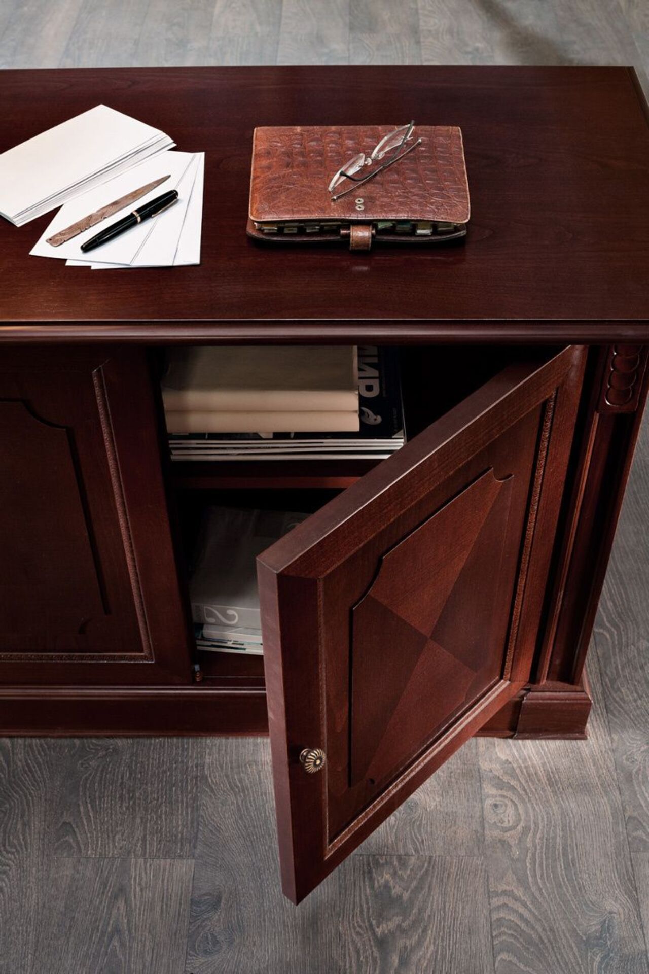 Кабинет руководителя Doge - итальянская классика, сочетающая в себе функциональность и безупречный стиль. Теплая текстура натурального дерева создадут атмосферу уюта и стабильности в вашем кабинете, а глубокий цвет Ореха Танганьика и рельефная резьба подчеркнут вашу индивидуальность.