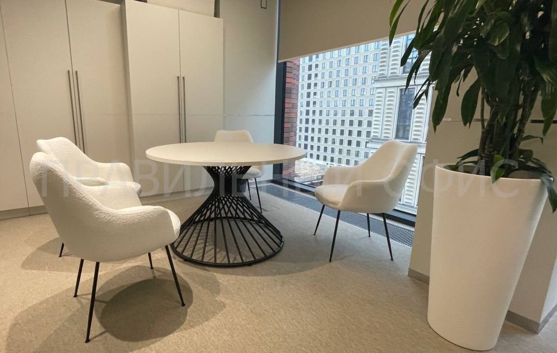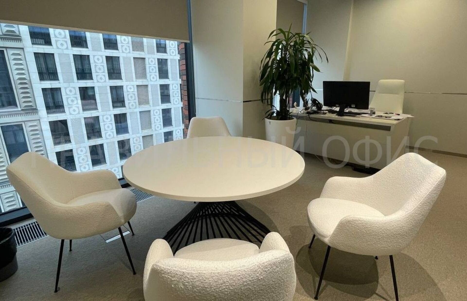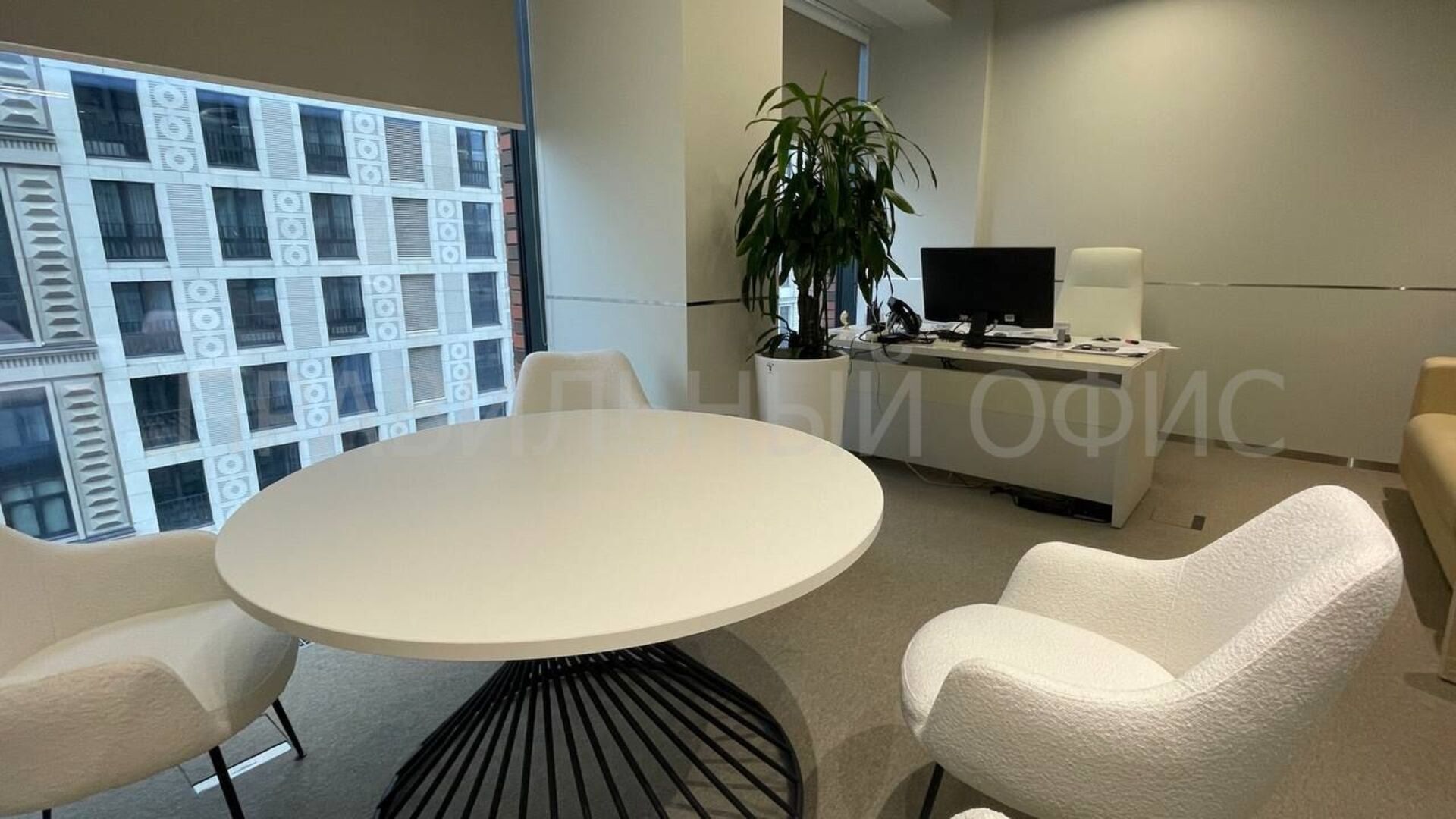 Все элементы мебели, включая переговорные столы, выполнены в единой цветовой гамме.