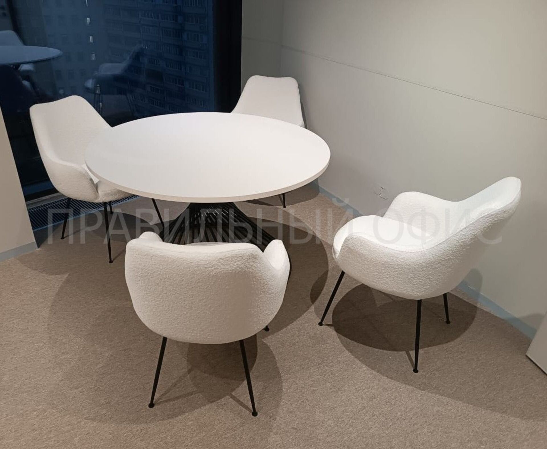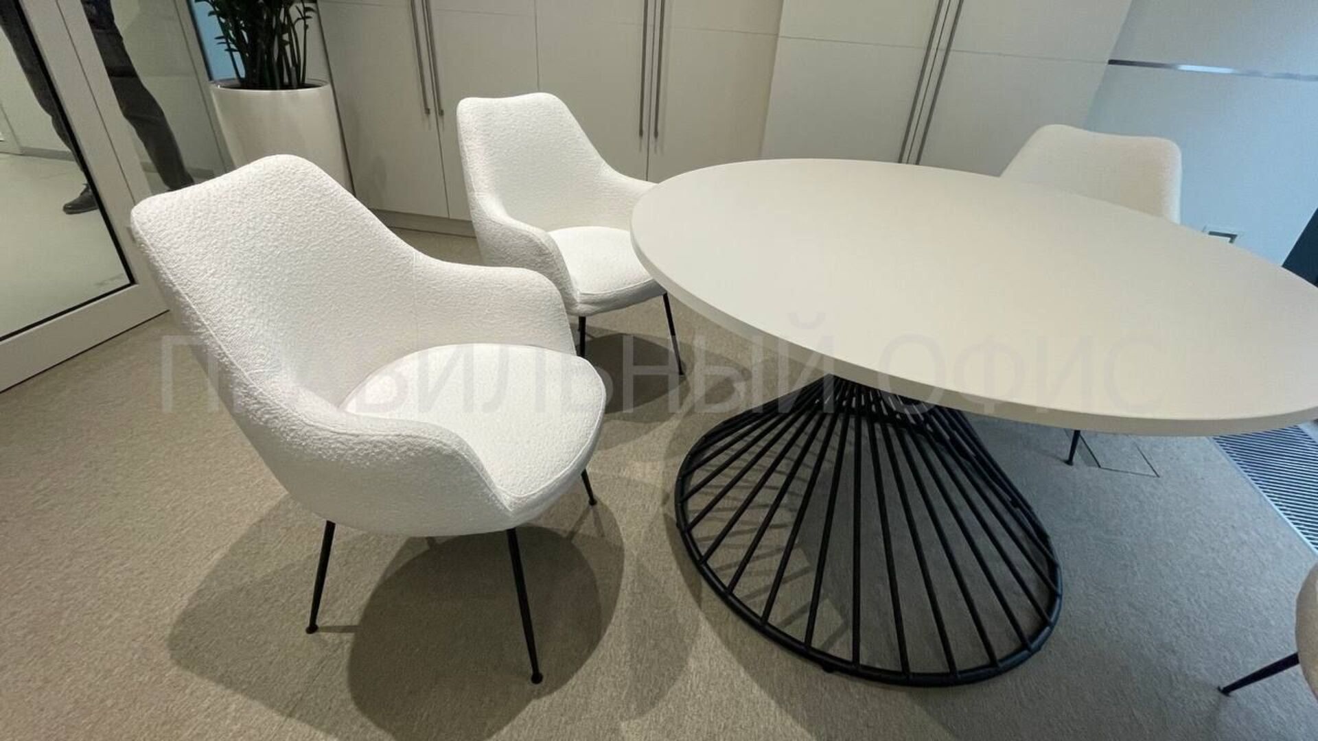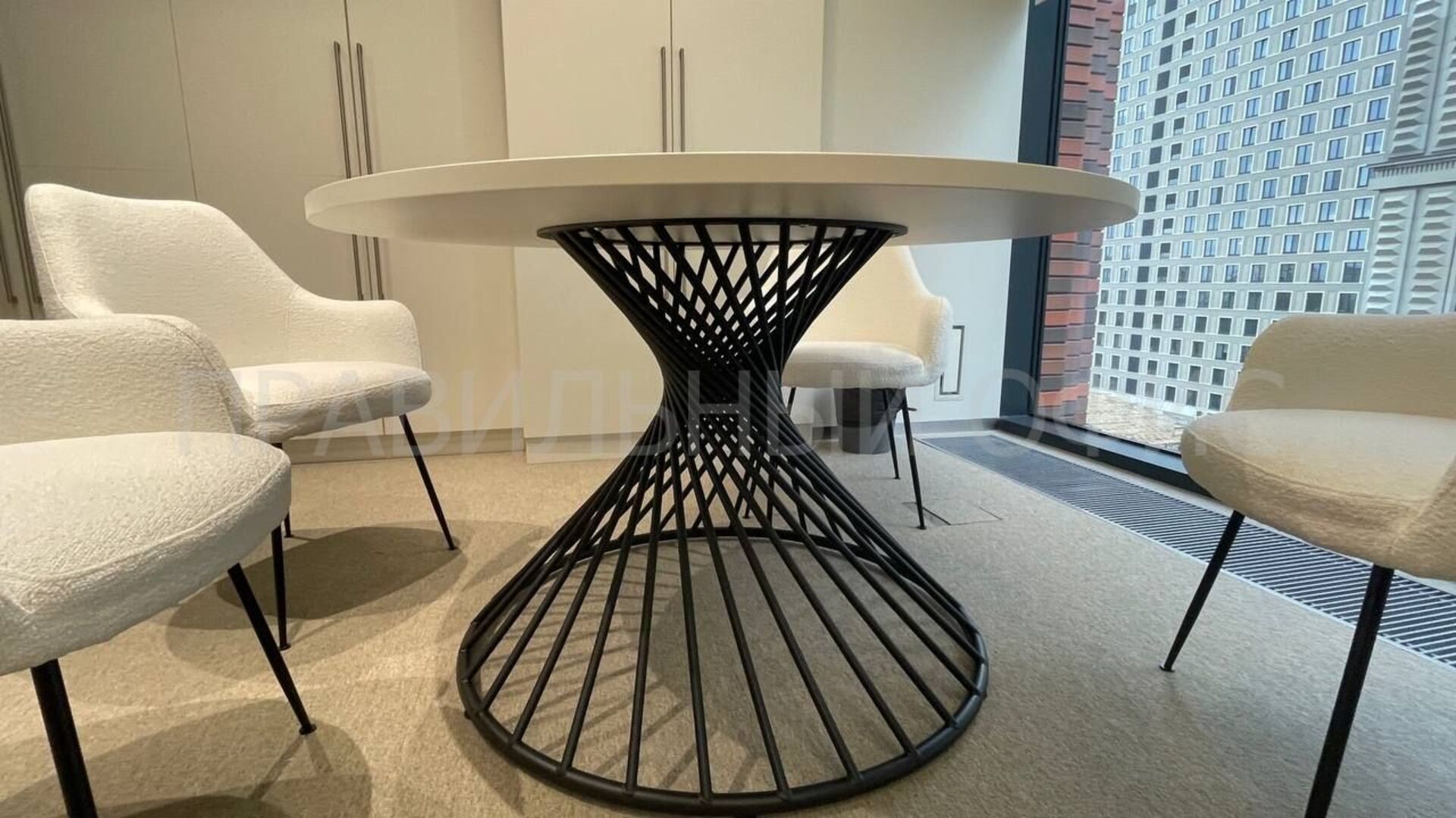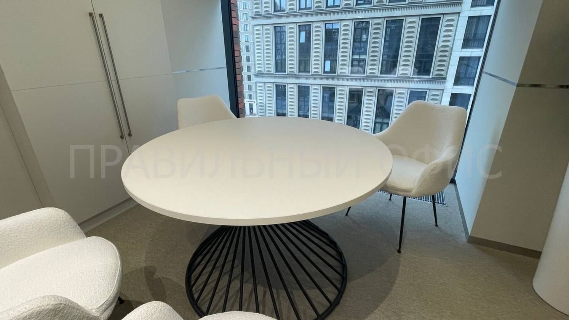 1. Переговорный круглый стол на заказ в цвете «Белый Фарфор» с металлическим каркасом «Антрацит». Столы серии Oak добавляют интерьеру легкости и стиля, сохраняя единство дизайна