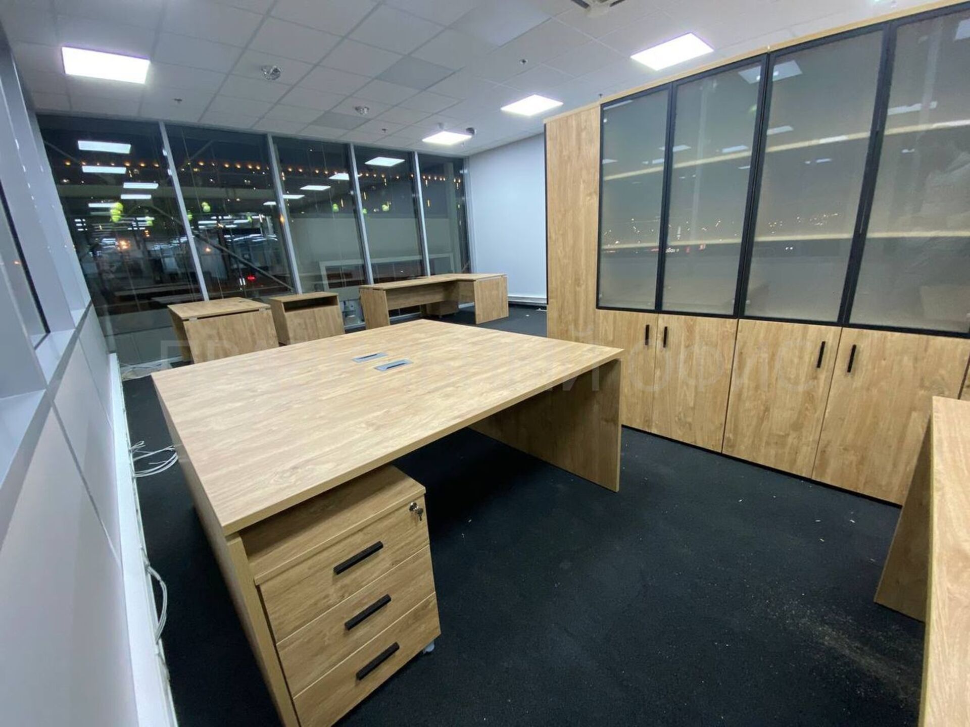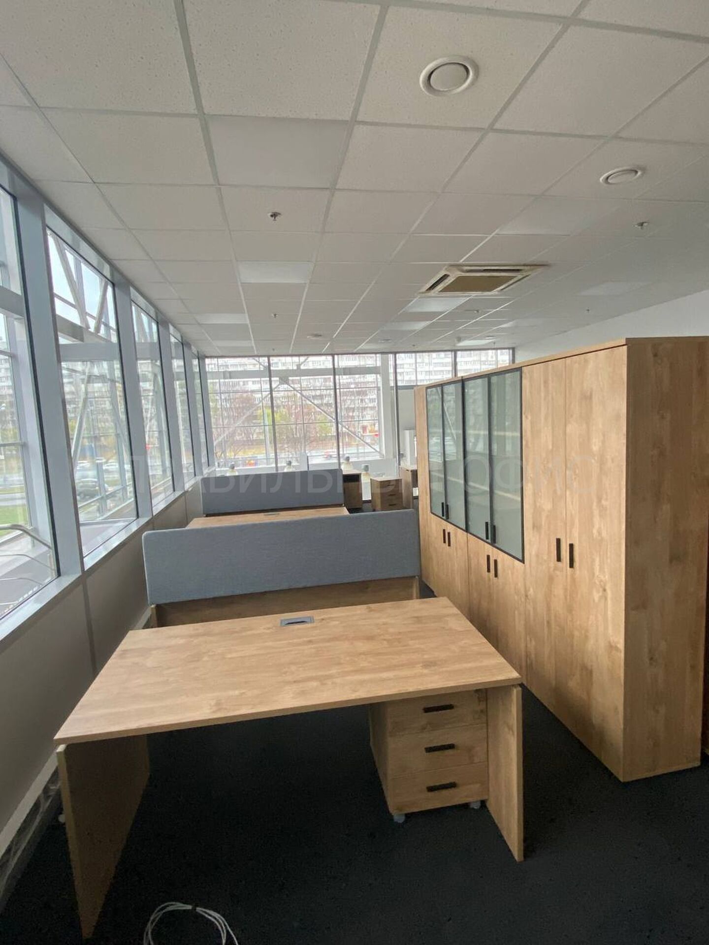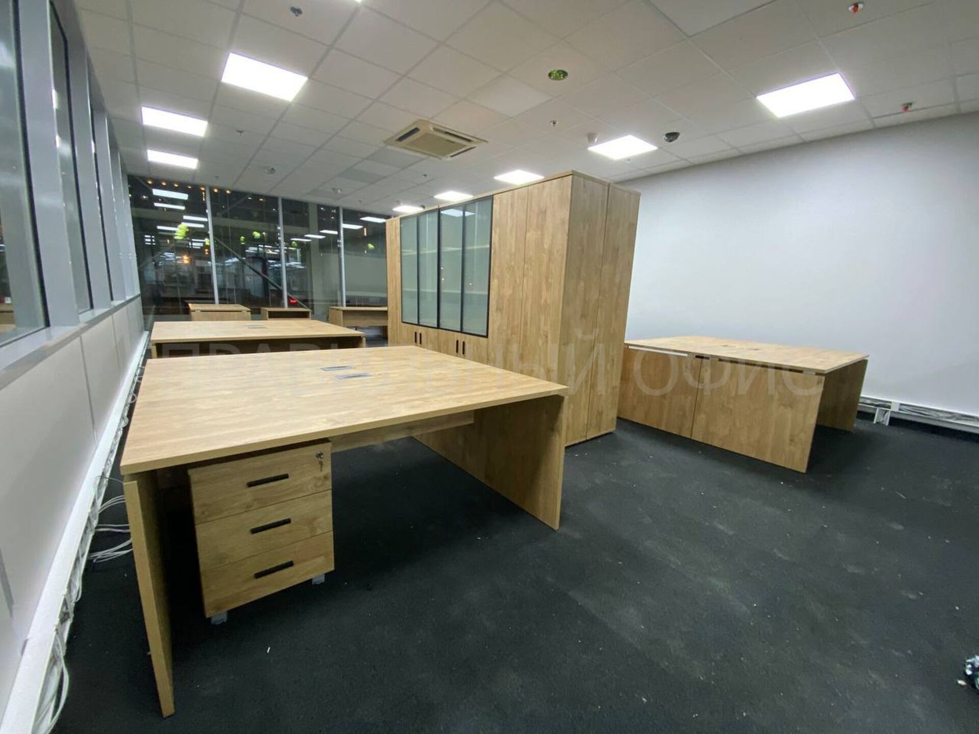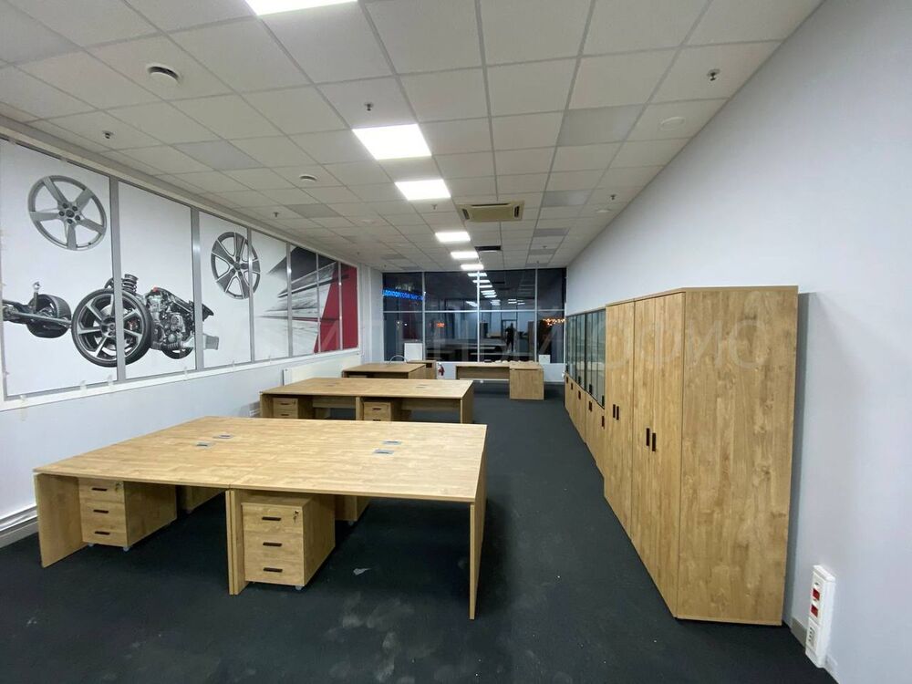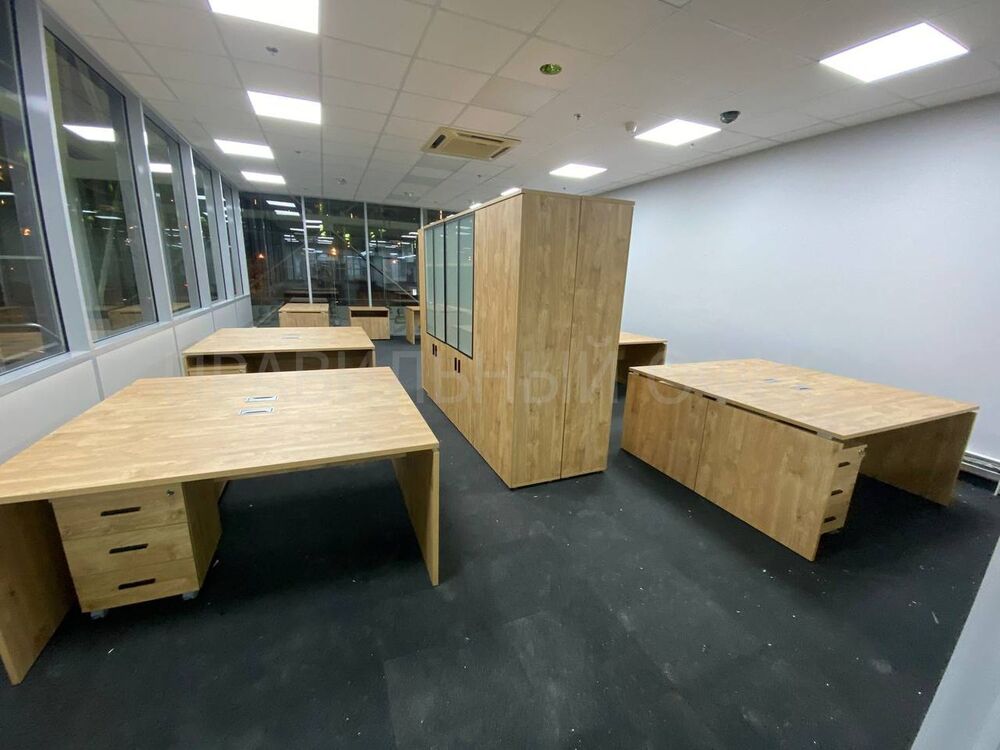 В конечном итоге проект включает в себя 58 столов на опорах ЛДСП, 58 мобильных тумбочек с центральным замком для хранения личных вещей сотрудников, 29 шкафов со стеклом для организации документации, 11 гардеробов для одежды, 6 тумбочек под оргтехнику и 6 брифингов, что позволяет осуществлять оперативное взаимодействие и обсуждение рабочих вопросов.
