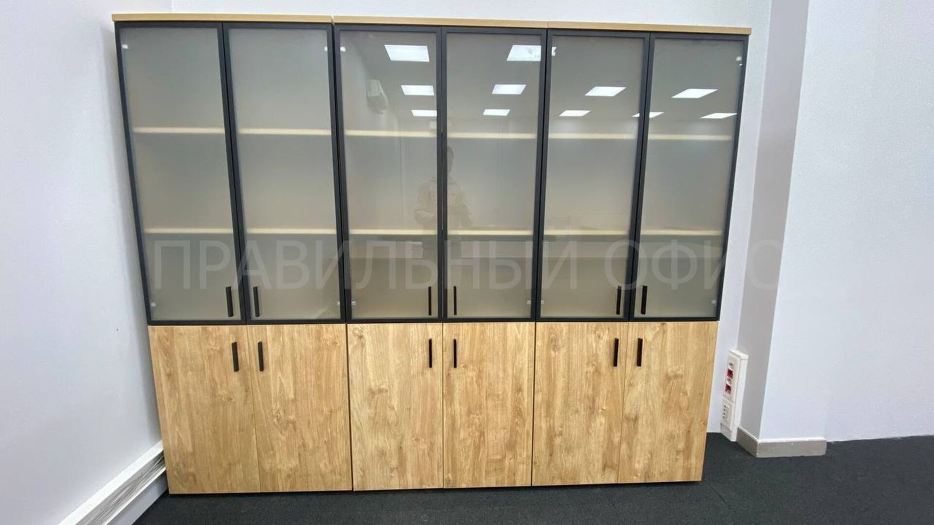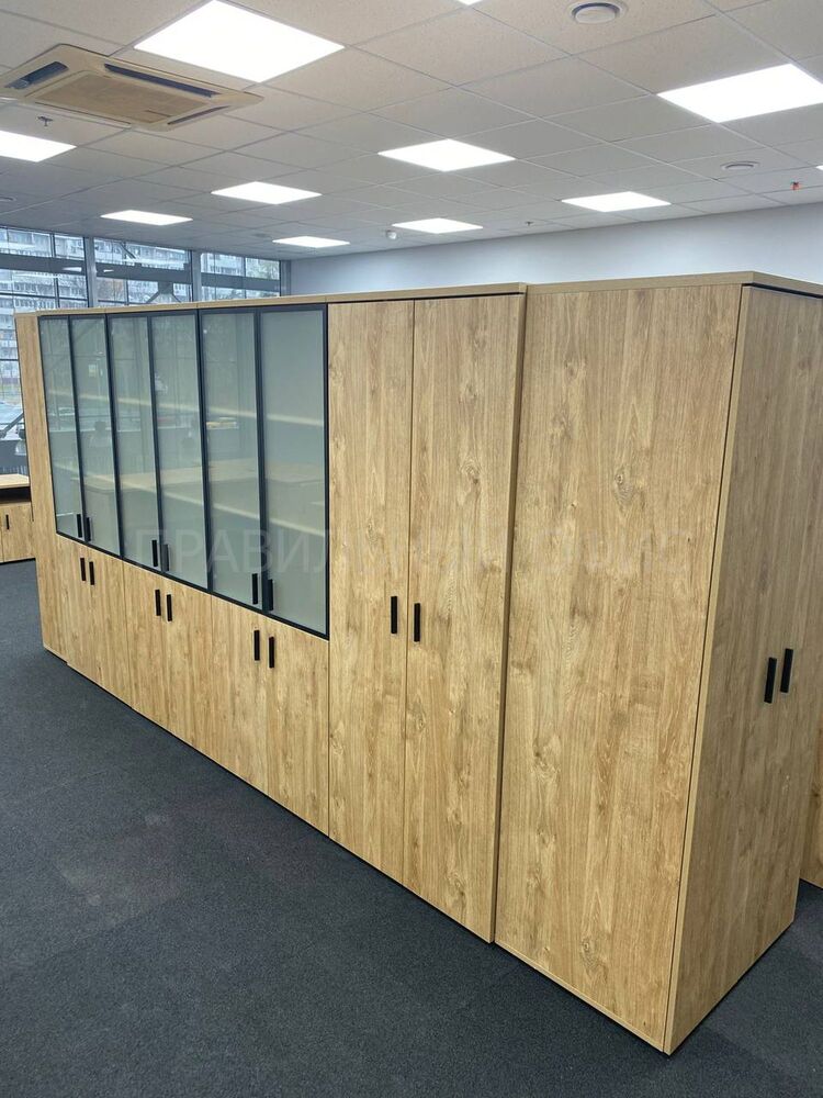 Одно из основных изменений — замена стандартного металлического профиля в рамах стеклянных дверей у шкафов для документов на профиль из темного металла. Это решение добавило современный и стильный элемент в оформление рабочего пространства. Кроме того, полностью была заменена лицевая фурнитура на всех фасадах, что также способствовало достижению уникального визуального эффекта.